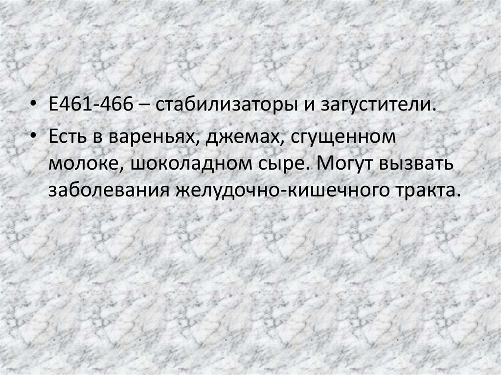 • Е461-466 – стабилизаторы и загустители.• Есть в вареньях, джемах, сгущенном