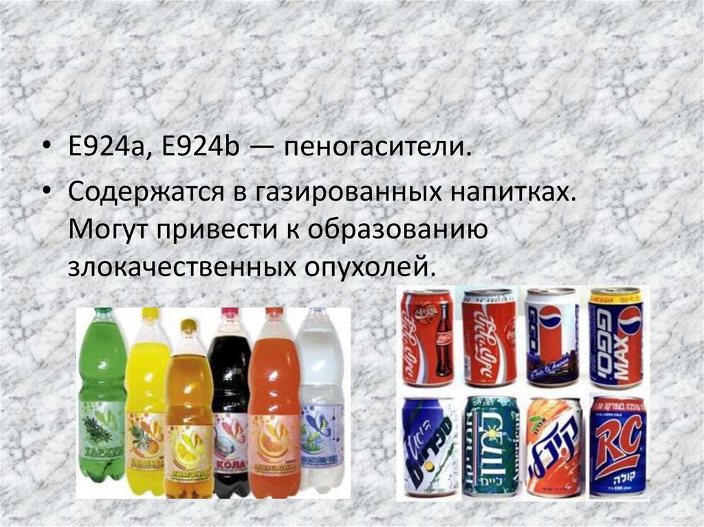 • Е924a, Е924b — пеногасители.• Содержатся в газированных напитках.