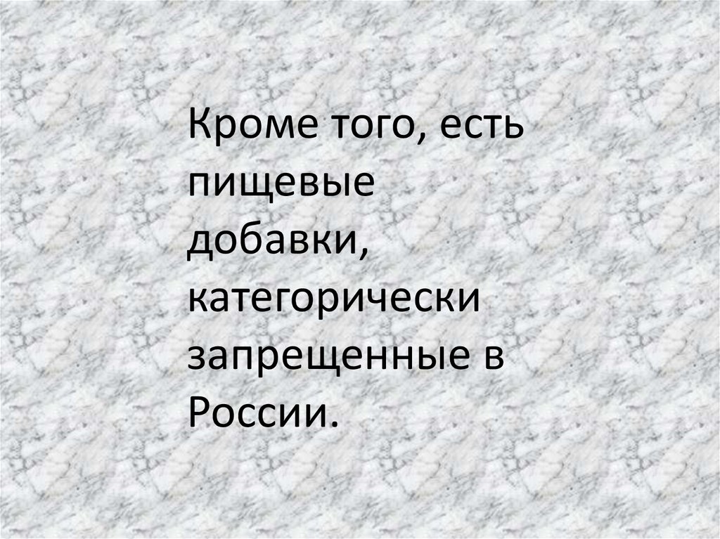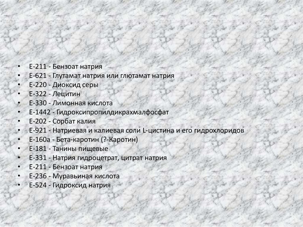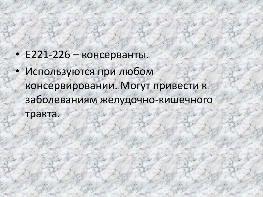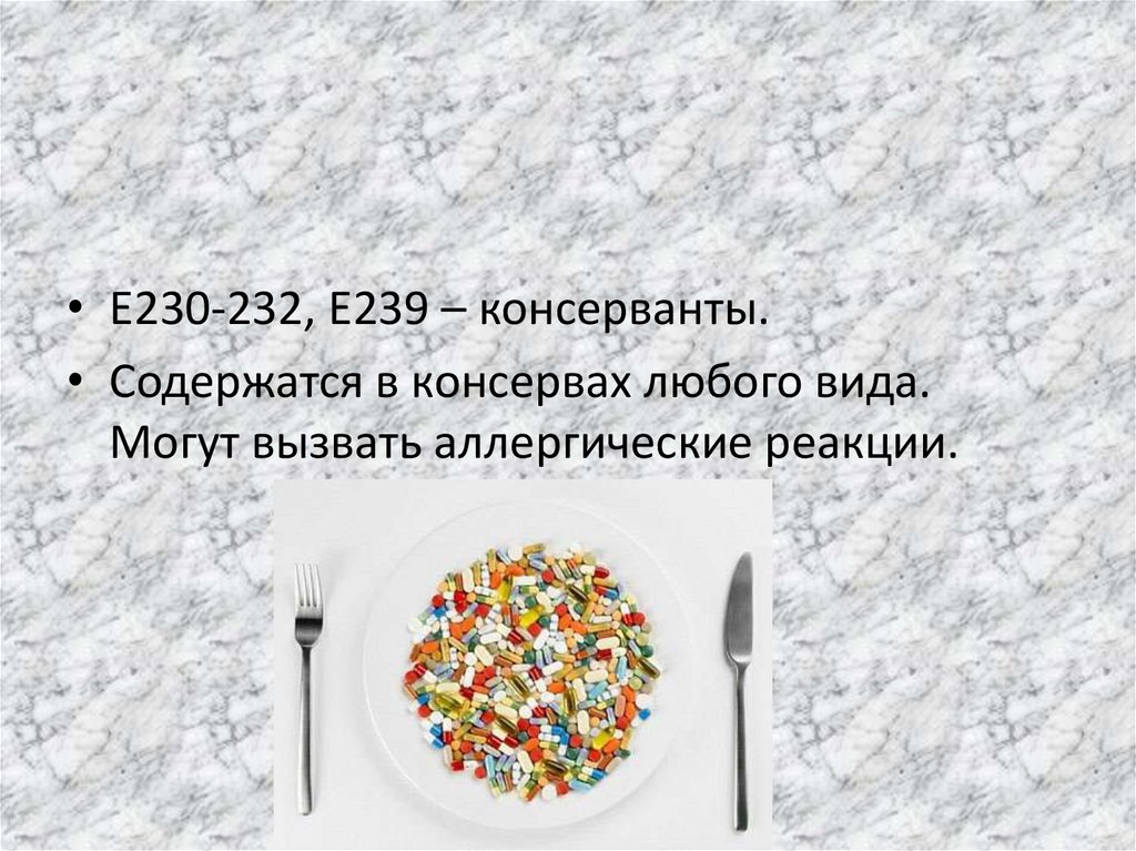 • Е230-232, Е239 – консерванты.• Содержатся в консервах любого вида.