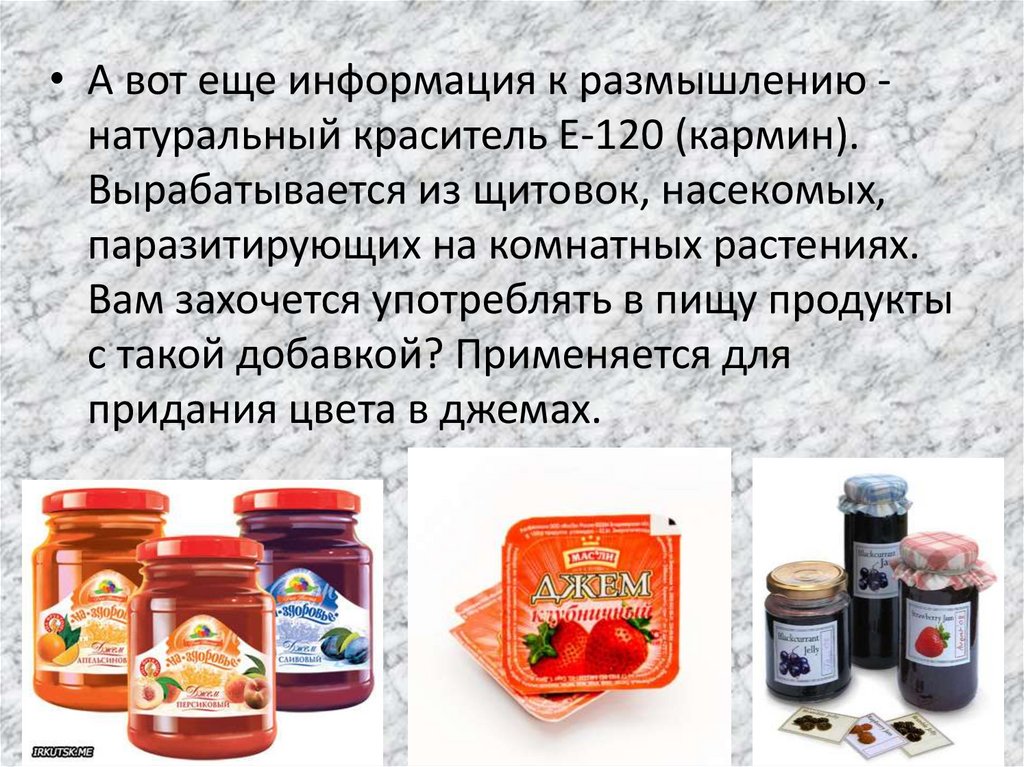 • А вот еще информация к размышлению натуральный краситель E-120 (кармин).Вырабатывается из щитовок, насекомых,