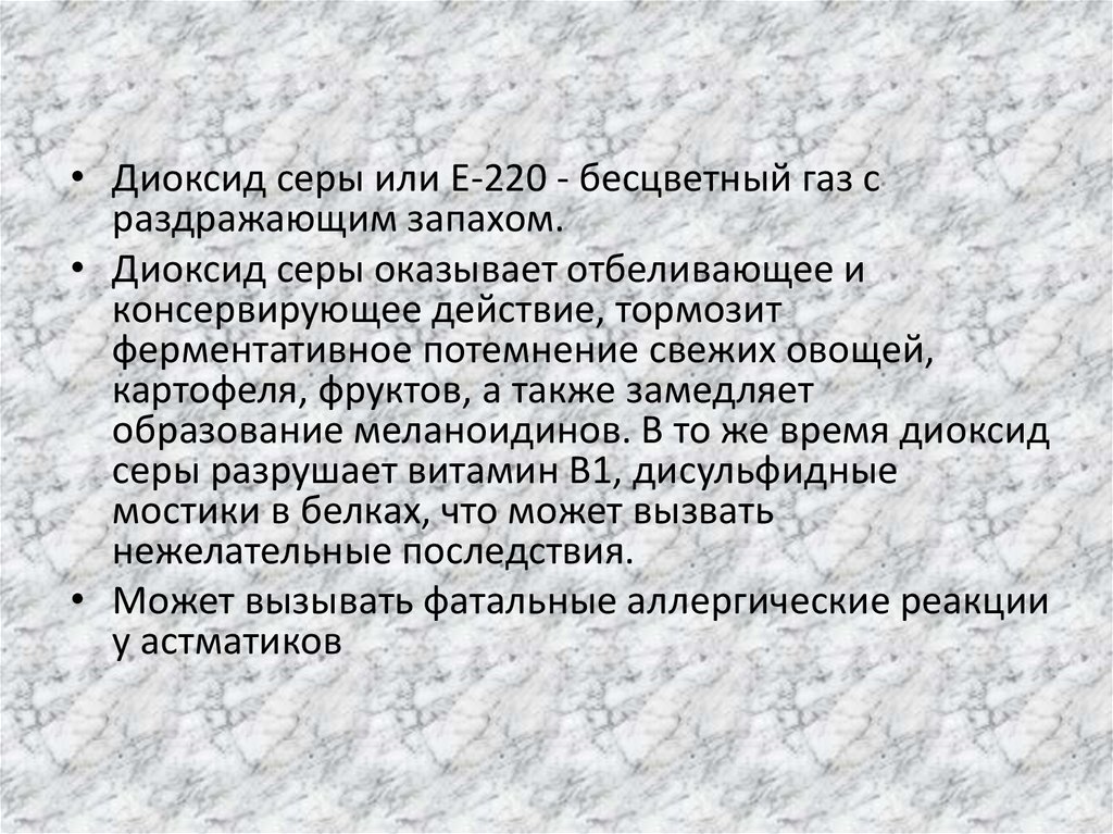 • Диоксид серы или Е-220 - бесцветный газ сраздражающим запахом.