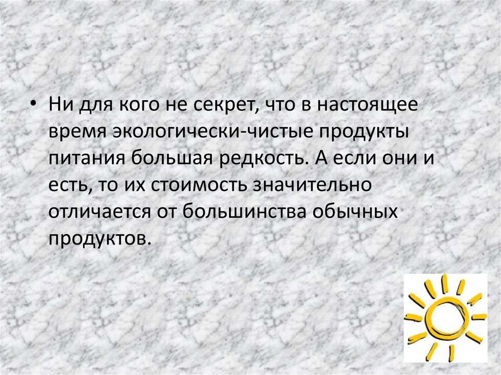 • Ни для кого не секрет, что в настоящеевремя экологически-чистые продукты