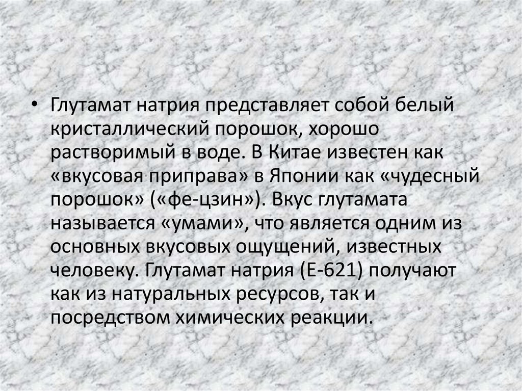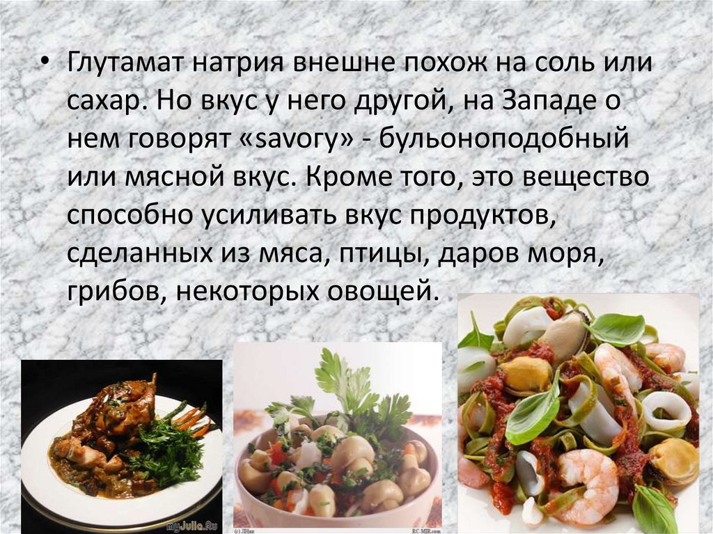 • Глутамат натрия внешне похож на соль илисахар. Но вкус у него другой, на Западе о