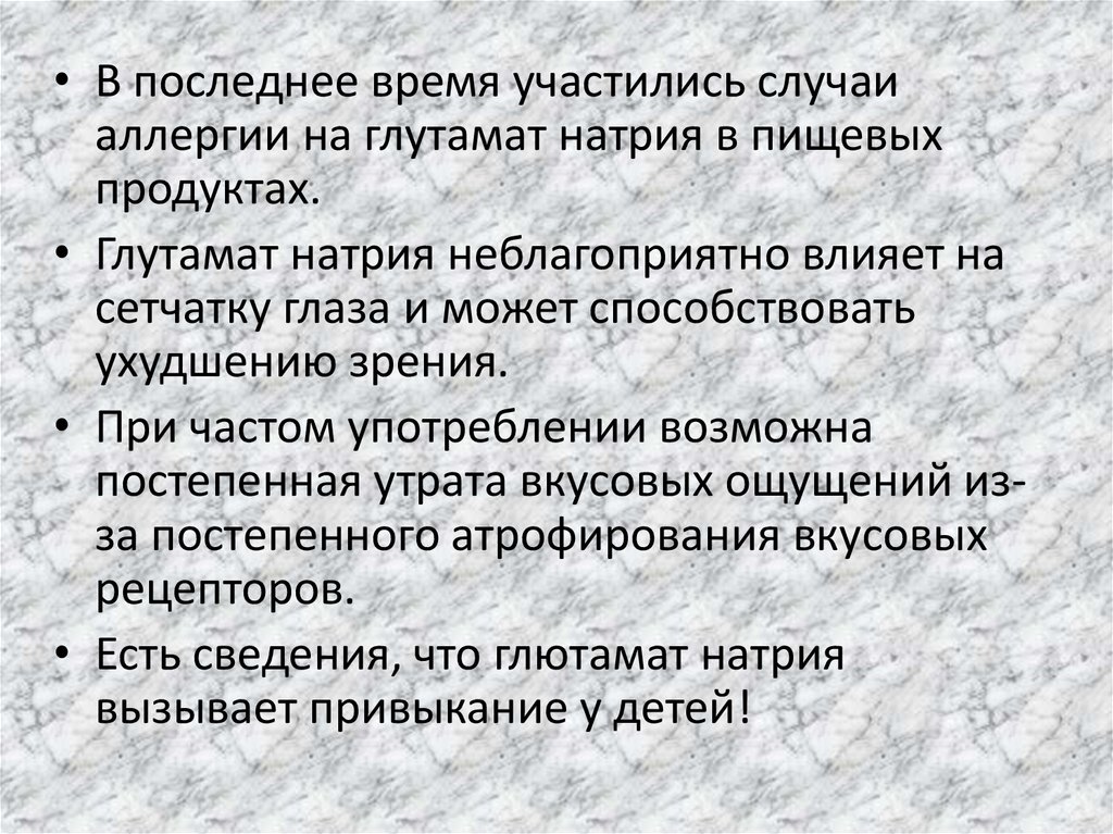 • В последнее время участились случаиаллергии на глутамат натрия в пищевых