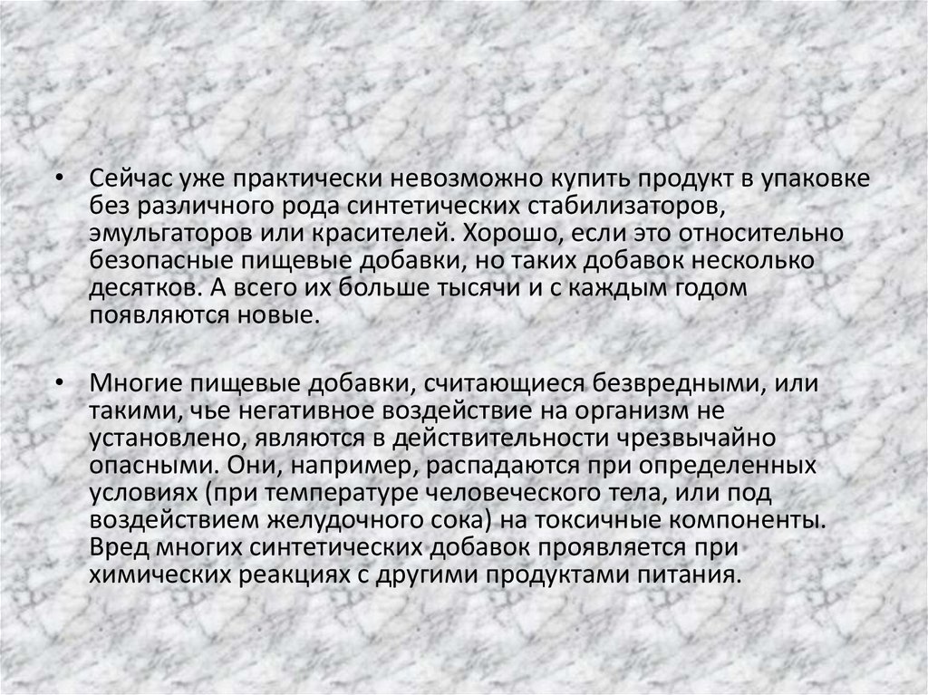 • Сейчас уже практически невозможно купить продукт в упаковкебез различного рода синтетических стабилизаторов,
