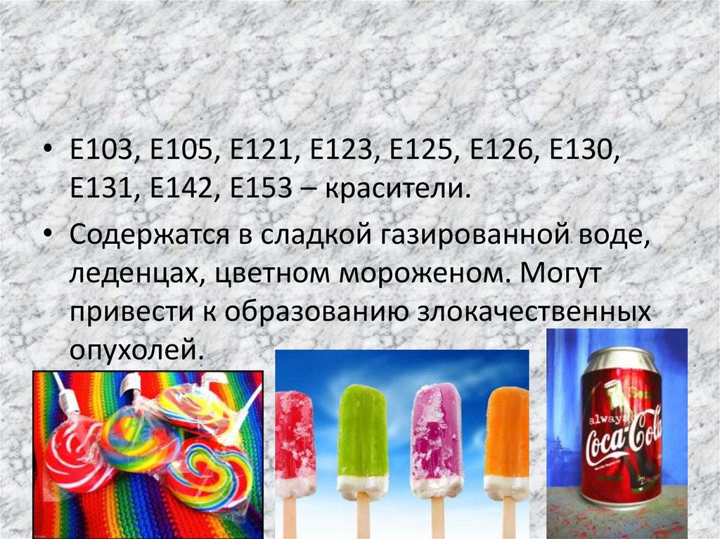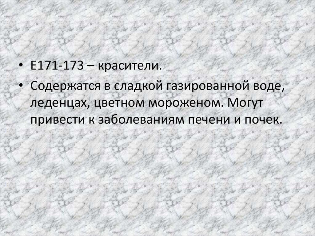 • Е171-173 – красители.• Содержатся в сладкой газированной воде,