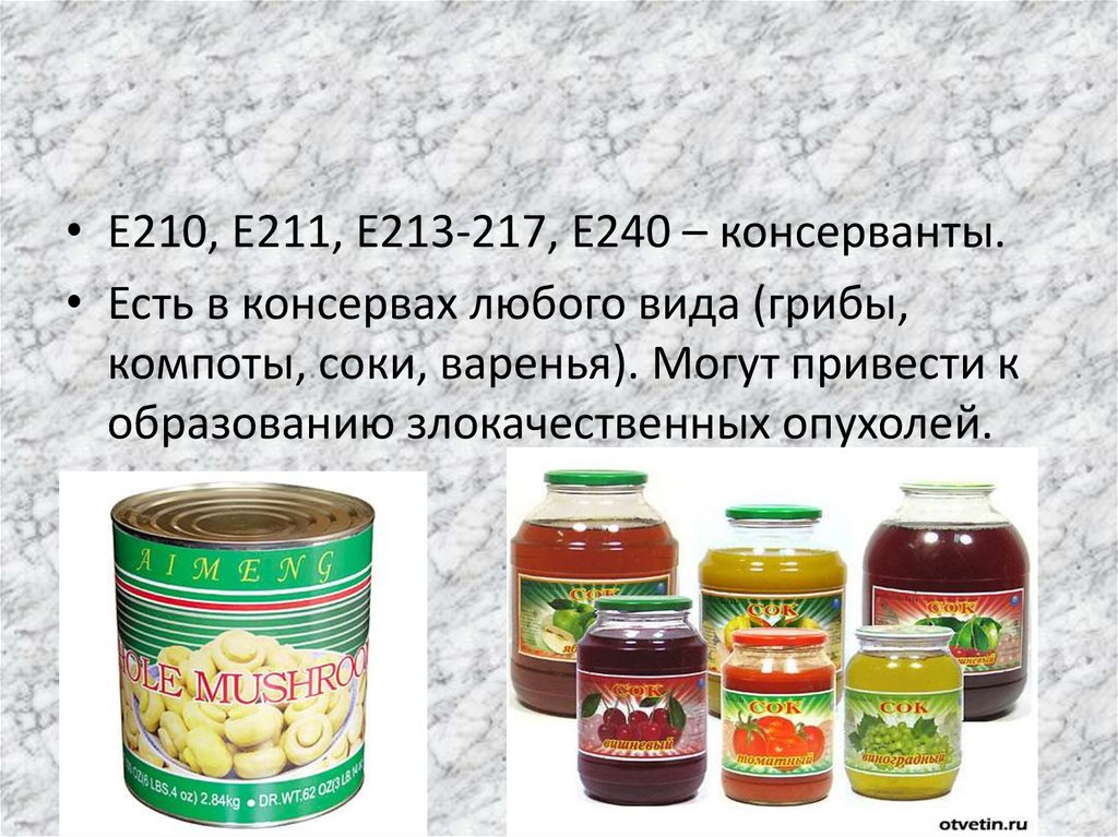 • Е210, Е211, Е213-217, Е240 – консерванты.• Есть в консервах любого вида (грибы,