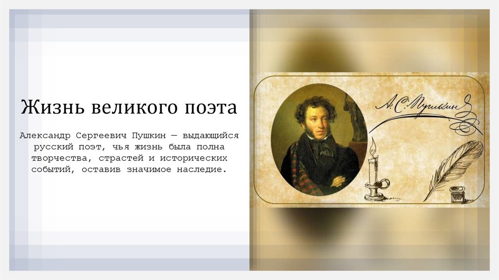 Жизнь великого поэтаАлександр Сергеевич Пушкин — выдающийся