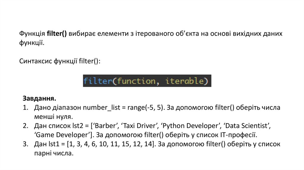 Функція filter() вибирає елементи з ітерованого об’єкта на основі вихідних данихфункції.