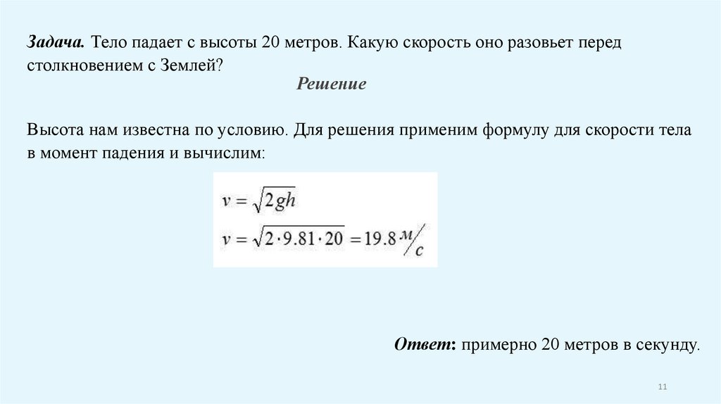 Задача. Тело падает с высоты 20 метров. Какую скорость оно разовьет передстолкновением с Землей?