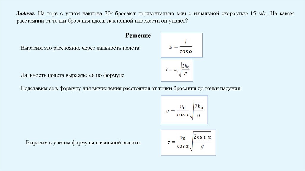 Задача. На горе с углом наклона 30о бросают горизонтально мяч с начальной скоростью 15 м/с. На какомрасстоянии от точки бросания вдоль наклонной плоскости он упадет?