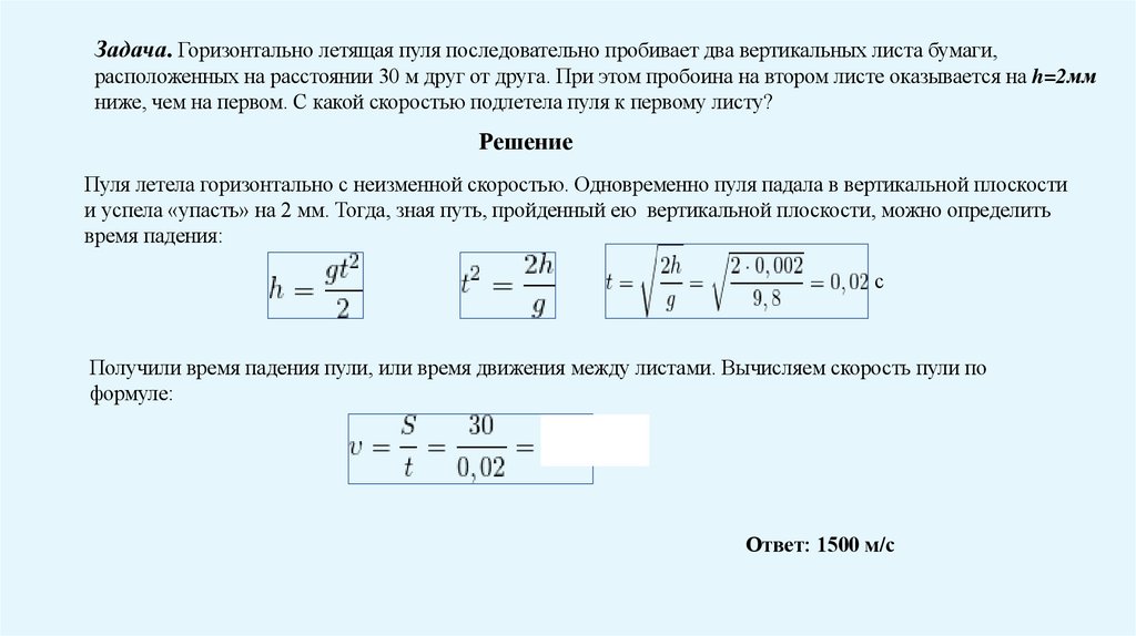 Задача. Горизонтально летящая пуля последовательно пробивает два вертикальных листа бумаги,расположенных на расстоянии 30 м друг от друга. При этом пробоина на втором листе оказывается на h=2мм