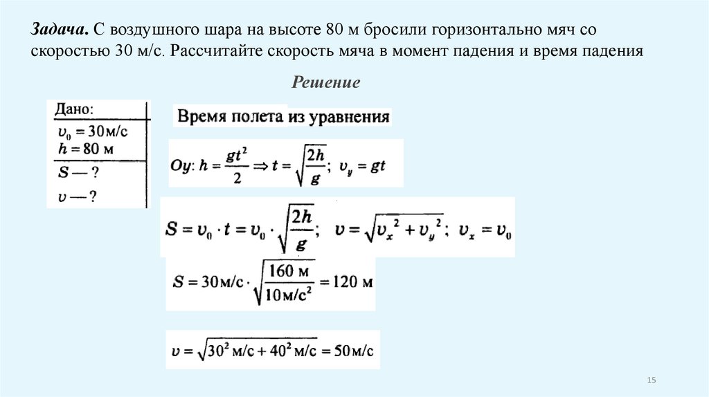 Задача. С воздушного шара на высоте 80 м бросили горизонтально мяч соскоростью 30 м/с. Рассчитайте скорость мяча в момент падения и время падения