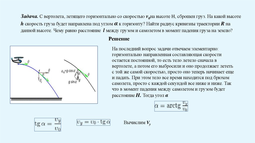 Задача. С вертолета, летящего горизонтально со скоростью v0на высоте H, сброшен груз. На какой высотеh скорость груза будет направлена под углом α к горизонту? Найти радиус кривизны траектории R на