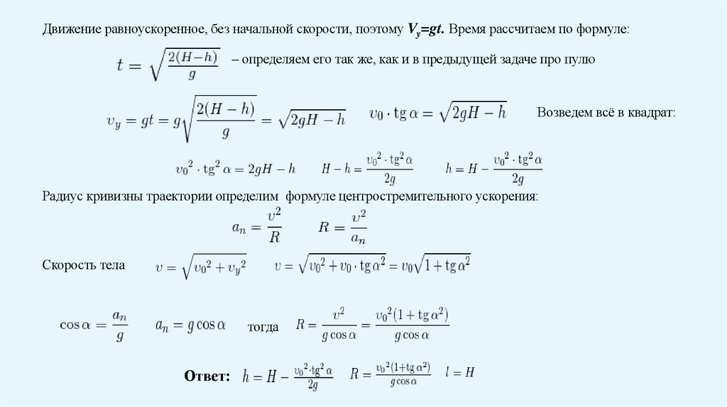 Движение равноускоренное, без начальной скорости, поэтому Vy=gt. Время рассчитаем по формуле:– определяем его так же, как и в предыдущей задаче про пулю