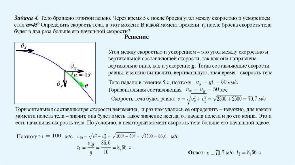 Задача 4. Тело брошено горизонтально. Через время 5 с после броска угол между скоростью и ускорениемстал α=450 Определить скорость тела. в этот момент. В какой момент времени t0 после броска скорость тела