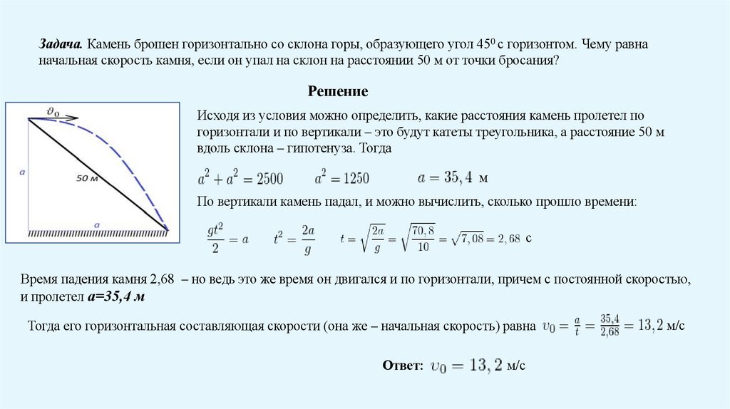 Задача. Камень брошен горизонтально со склона горы, образующего угол 450 с горизонтом. Чему равнаначальная скорость камня, если он упал на склон на расстоянии 50 м от точки бросания?