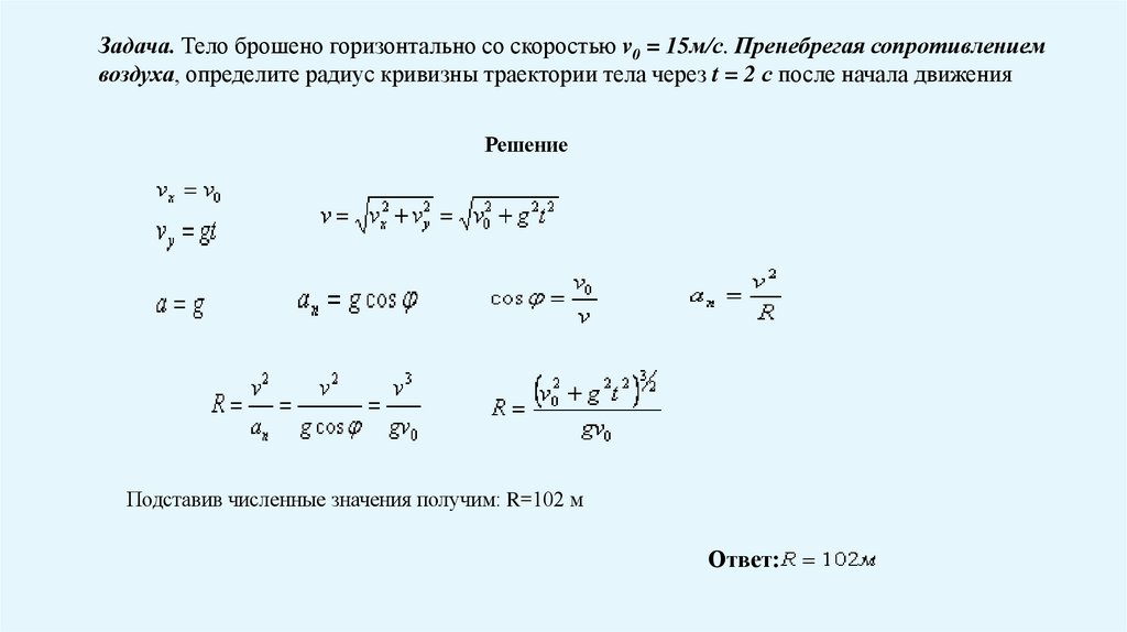 Задача. Тело брошено горизонтально со скоростью v0 = 15м/с. Пренебрегая сопротивлениемвоздуха, определите радиус кривизны траектории тела через t = 2 с после начала движения