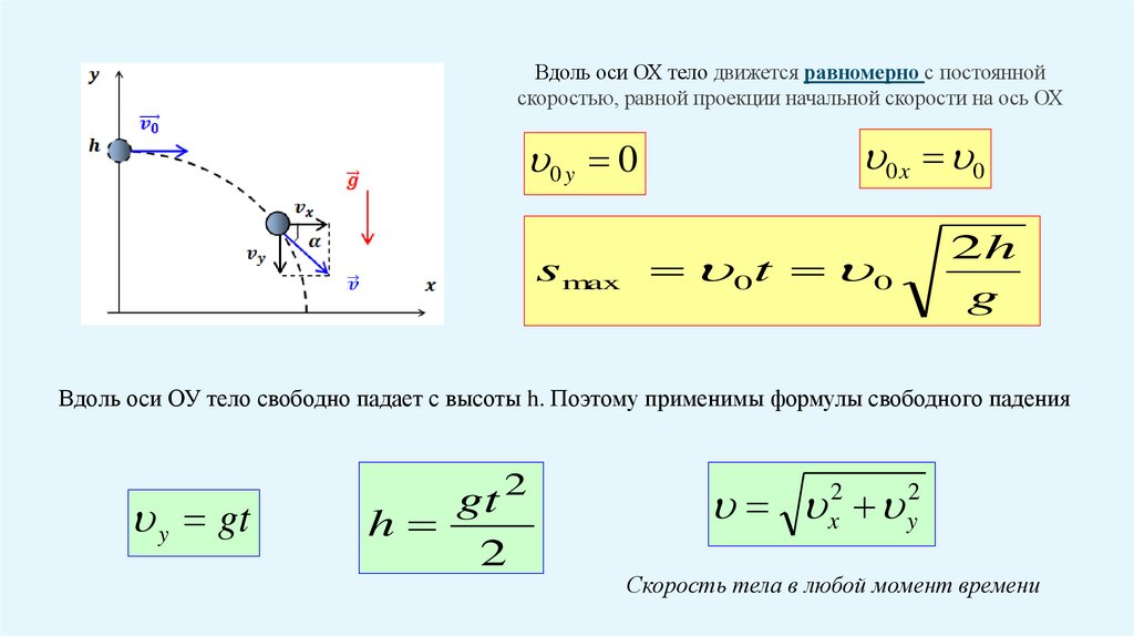 Вдоль оси ОУ тело свободно падает с высоты h. Поэтому применимы формулы свободного падения