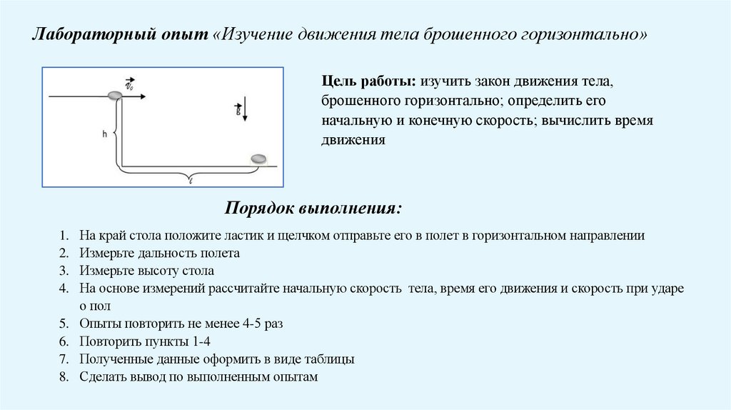 Лабораторный опыт «Изучение движения тела брошенного горизонтально»Цель работы: изучить закон движения тела,