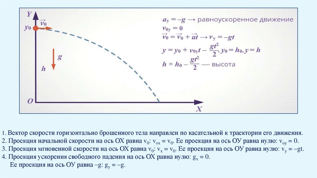 1. Вектор скорости горизонтально брошенного тела направлен по касательной к траектории его движения.2. Проекция начальной скорости на ось ОХ равна v0: vox = v0. Ее проекция на ось ОУ равна нулю: voy = 0.