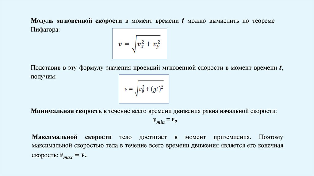 Модуль мгновенной скорости в момент времени t можно вычислить по теоремеПифагора: