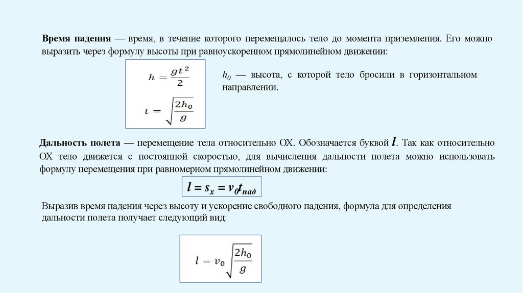 Время падения — время, в течение которого перемещалось тело до момента приземления. Его можновыразить через формулу высоты при равноускоренном прямолинейном движении:
