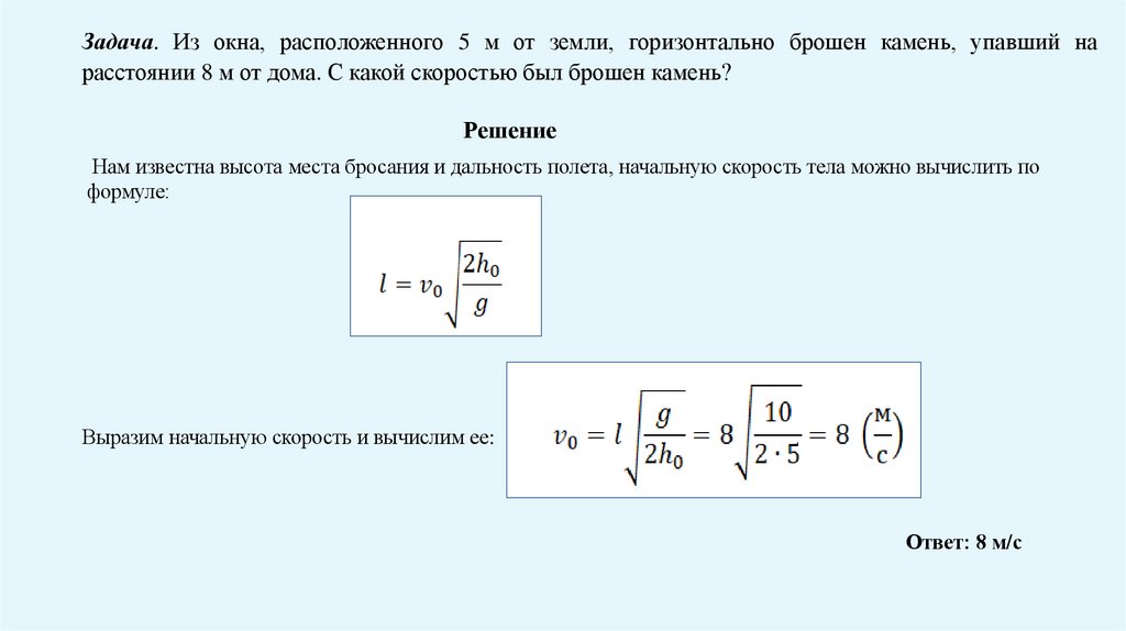 Задача. Из окна, расположенного 5 м от земли, горизонтально брошен камень, упавший нарасстоянии 8 м от дома. С какой скоростью был брошен камень?