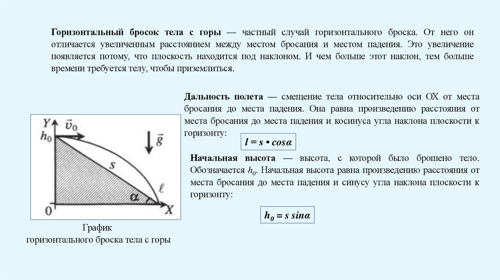 Горизонтальный бросок тела с горы — частный случай горизонтального броска. От него онотличается увеличенным расстоянием между местом бросания и местом падения. Это увеличение