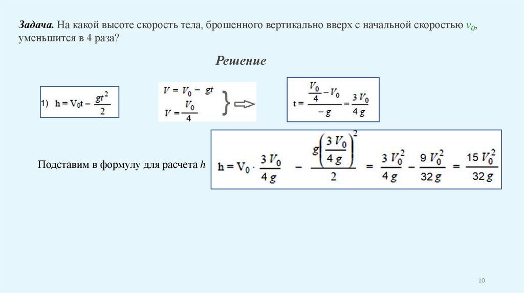 Задача. На какой высоте скорость тела, брошенного вертикально вверх с начальной скоростью v0,уменьшится в 4 раза?