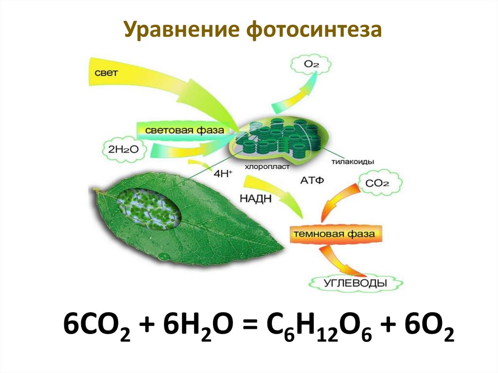 Уравнение фотосинтеза6CO2 + 6H2O = C6H12O6 + 6О2