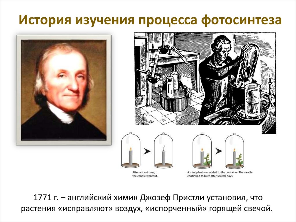 История изучения процесса фотосинтеза1771 г. – английский химик Джозеф Пристли установил, что