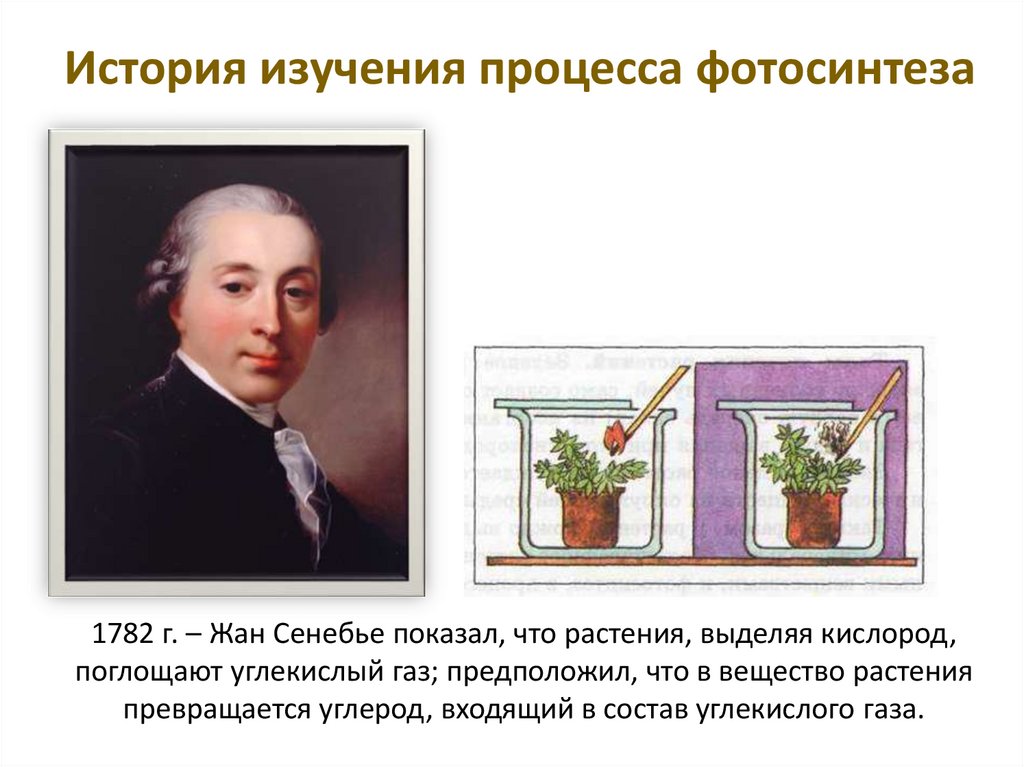 История изучения процесса фотосинтеза1782 г. – Жан Сенебье показал, что растения, выделяя кислород,