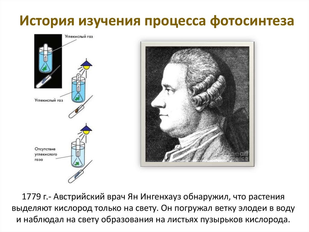 История изучения процесса фотосинтеза1779 г.- Австрийский врач Ян Ингенхауз обнаружил, что растения