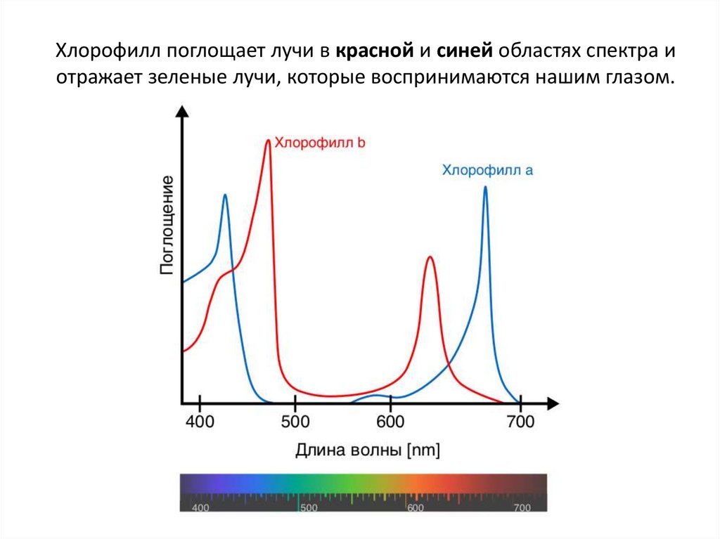 Хлорофилл поглощает лучи в красной и синей областях спектра иотражает зеленые лучи, которые воспринимаются нашим глазом.