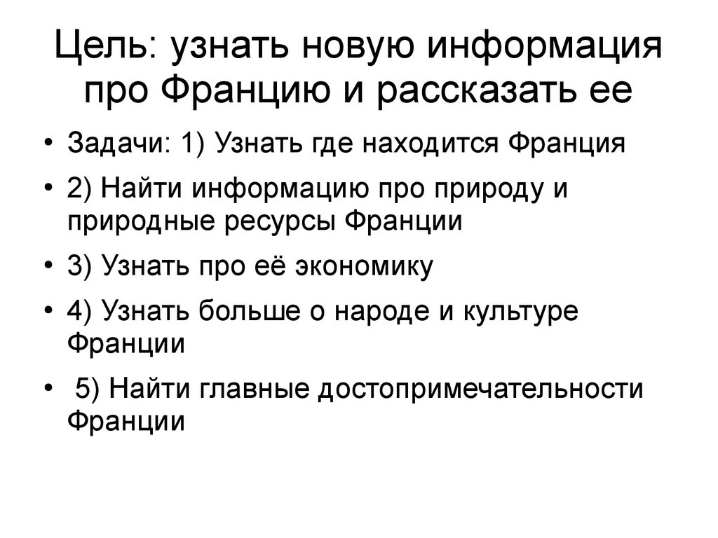 Цель: узнать новую информацияпро Францию и рассказать ее