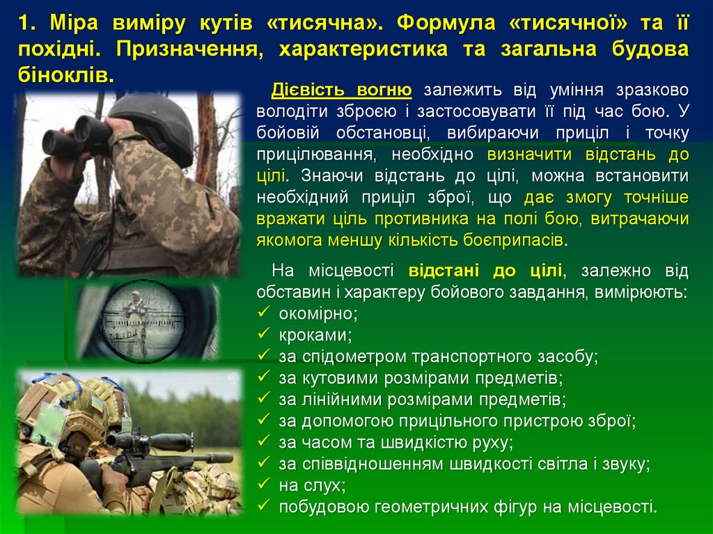 1. Міра виміру кутів «тисячна». Формула «тисячної» та їїпохідні. Призначення, характеристика та загальна будова