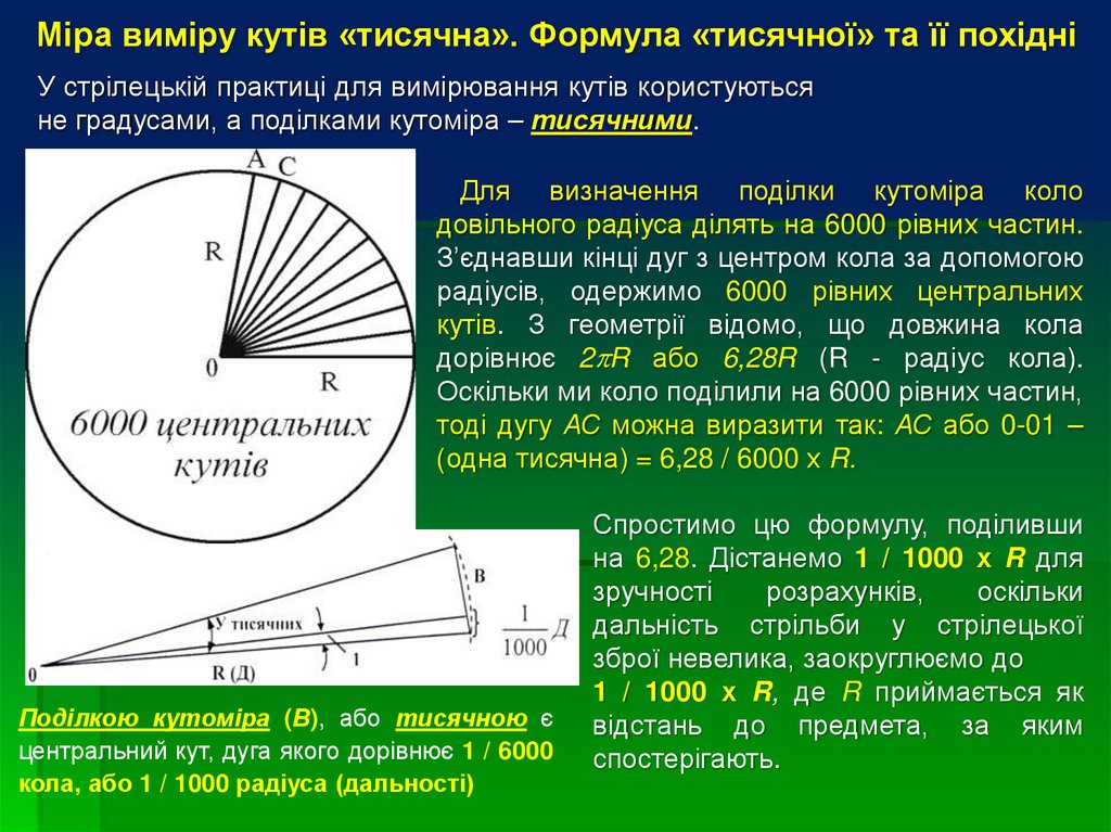 Міра виміру кутів «тисячна». Формула «тисячної» та її похідніВ залежності від кута, дуга якого дорівнює 1/6000 кола, й радіуса