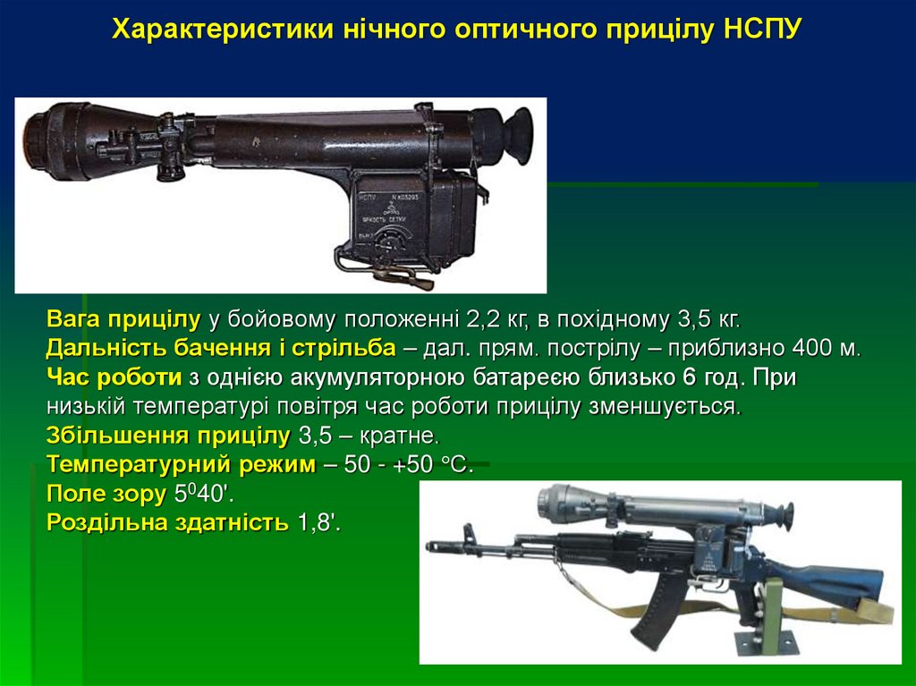 Характеристики нічного оптичного прицілу НСПУВага прицілу у бойовому положенні 2,2 кг, в похідному 3,5 кг.