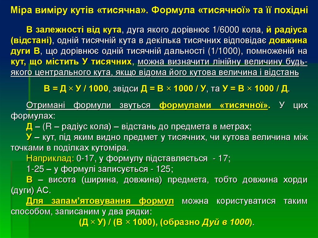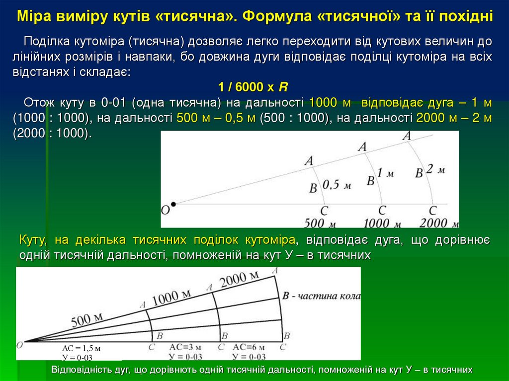 кут, що містить У тисячних, можна визначити лінійну величину будьякого центрального кута, якщо відома його кутова величина і відстань