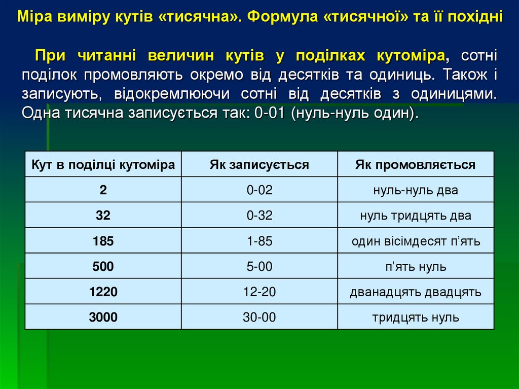 Міра виміру кутів «тисячна». Формула «тисячної» та її похідніПри читанні величин кутів у поділках кутоміра, сотні