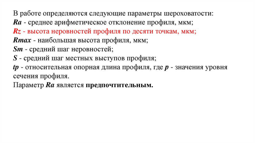 В работе определяются следующие параметры шероховатости:Ra - среднее арифметическое отклонение профиля, мкм;