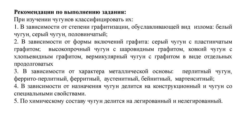 Рекомендации по выполнению задания:При изучении чугунов классифицировать их:
