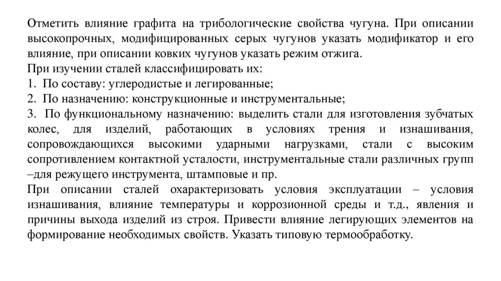 Отметить влияние графита на трибологические свойства чугуна. При описаниивысокопрочных, модифицированных серых чугунов указать модификатор и его
