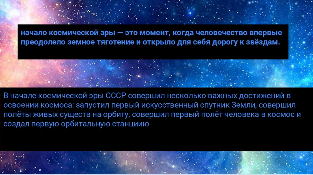начало космической эры — это момент, когда человечество впервыепреодолело земное тяготение и открыло для себя дорогу к звёздам.
