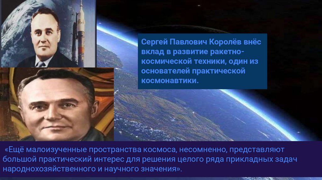 Сергей Павлович Королёв внёсвклад в развитие ракетнокосмической техники, один из