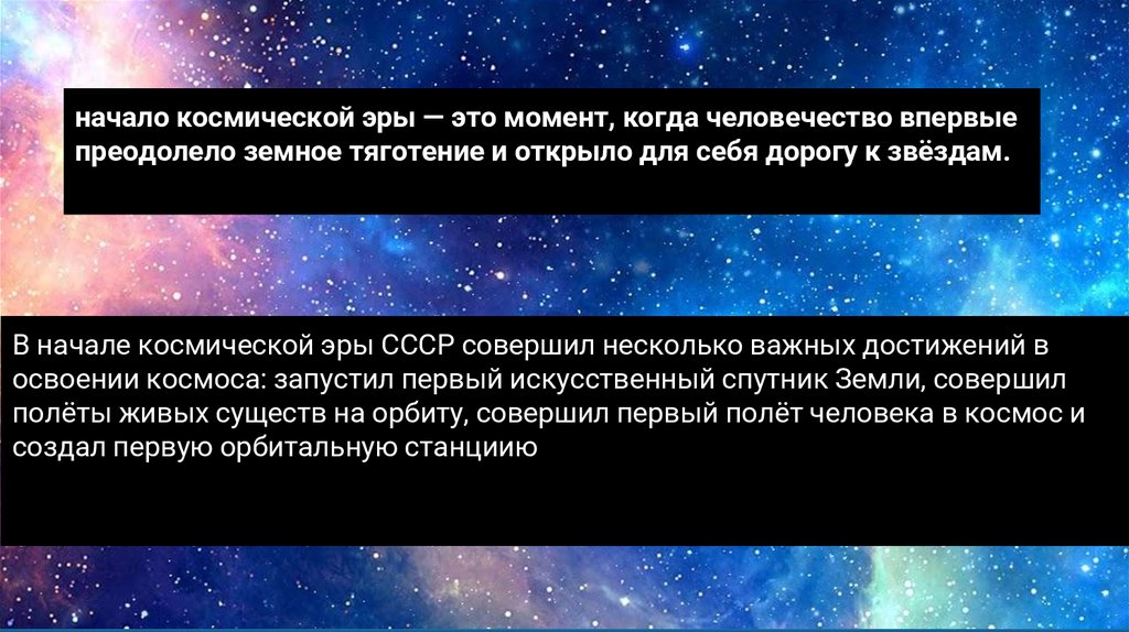 начало космической эры — это момент, когда человечество впервыепреодолело земное тяготение и открыло для себя дорогу к звёздам.