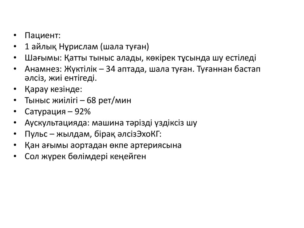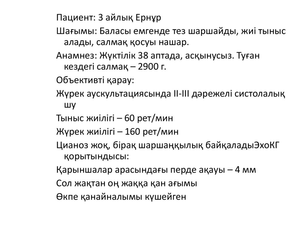 Пациент: 3 айлық ЕрнұрШағымы: Баласы емгенде тез шаршайды, жиі тыныс