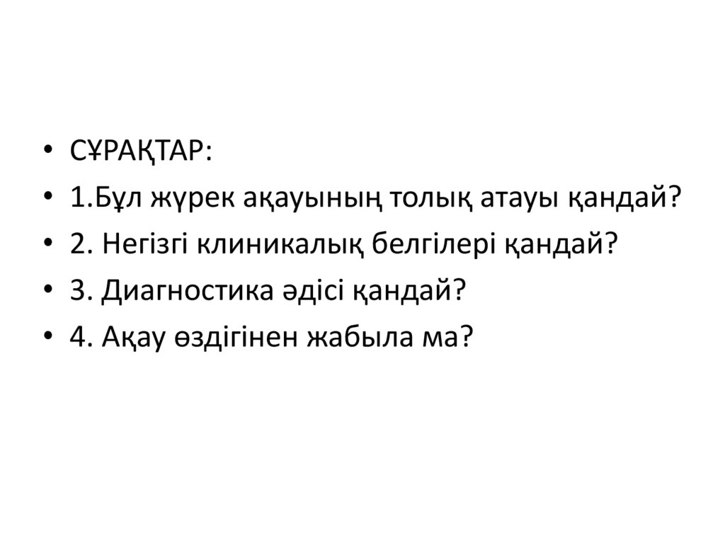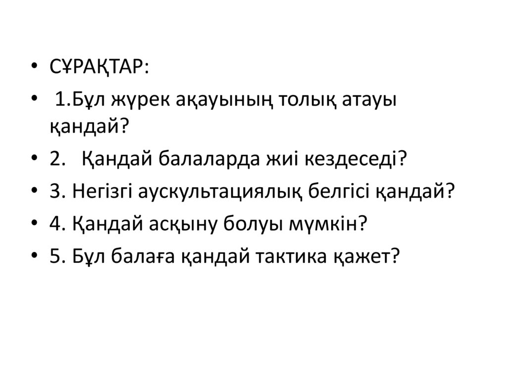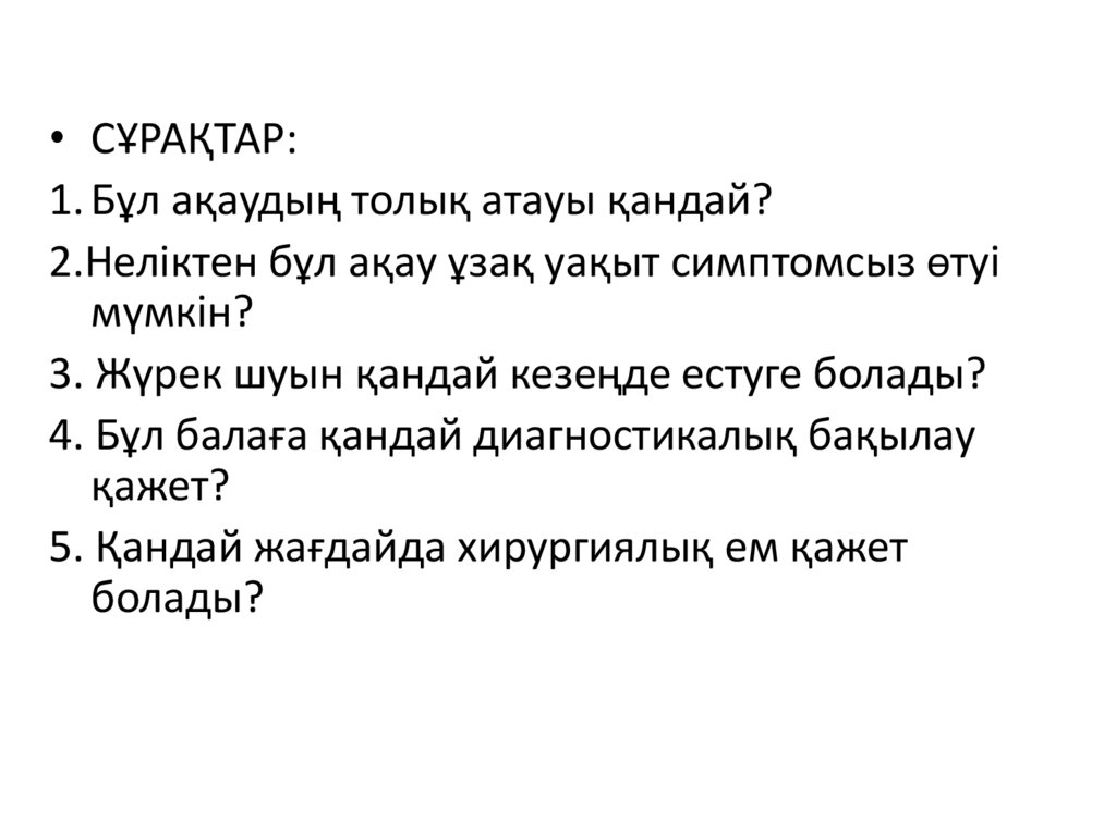 • СҰРАҚТАР:• 1.Бұл жүрек ақауының толық атауы қандай?