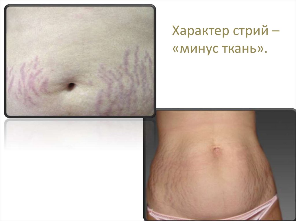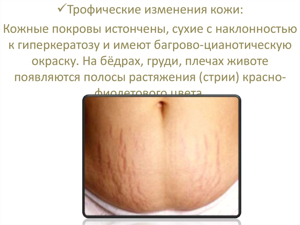 появляются полосы растяжения (стрии) краснофиолетового цвета.